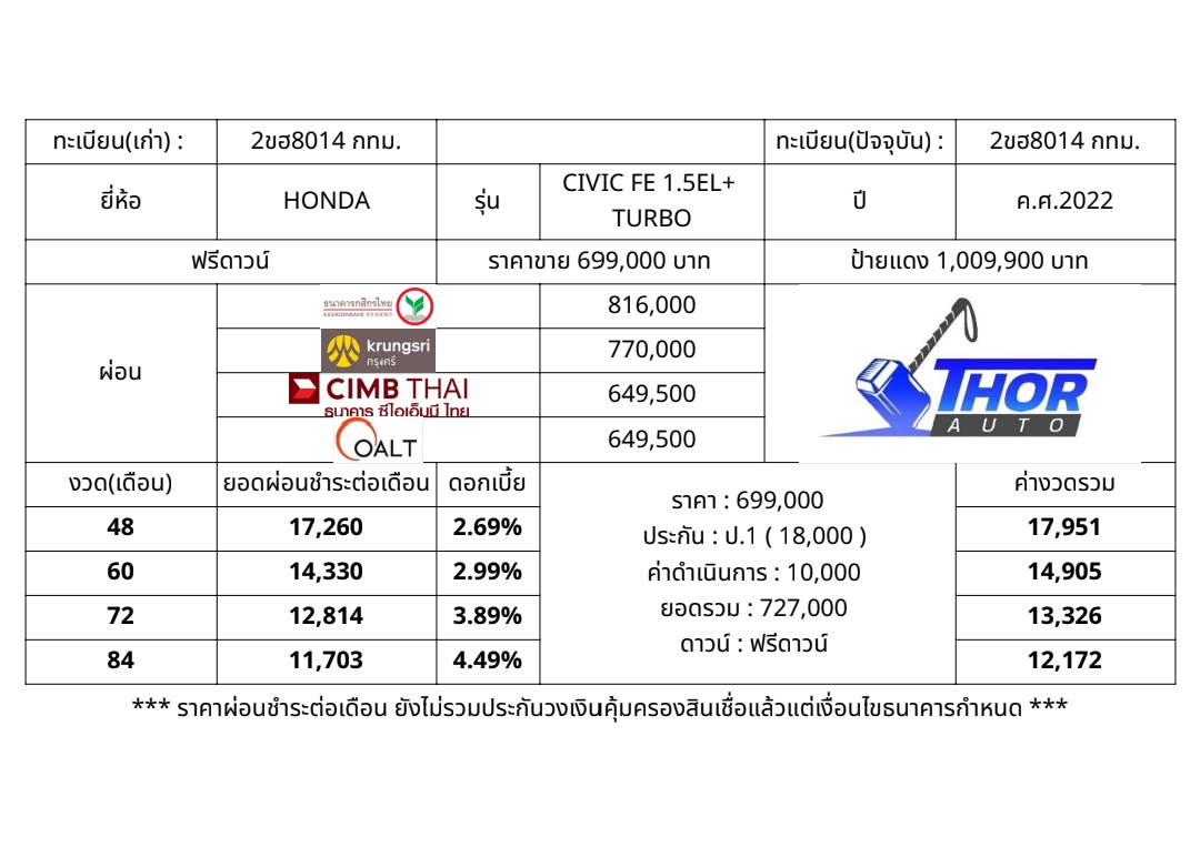 รุ่น: ซีวิค 1.5 อีแอล พลัส เทอร์โบ (Civic 1.5 EL+ TURBO) / รหัสตัวถัง FE / ปี 2022