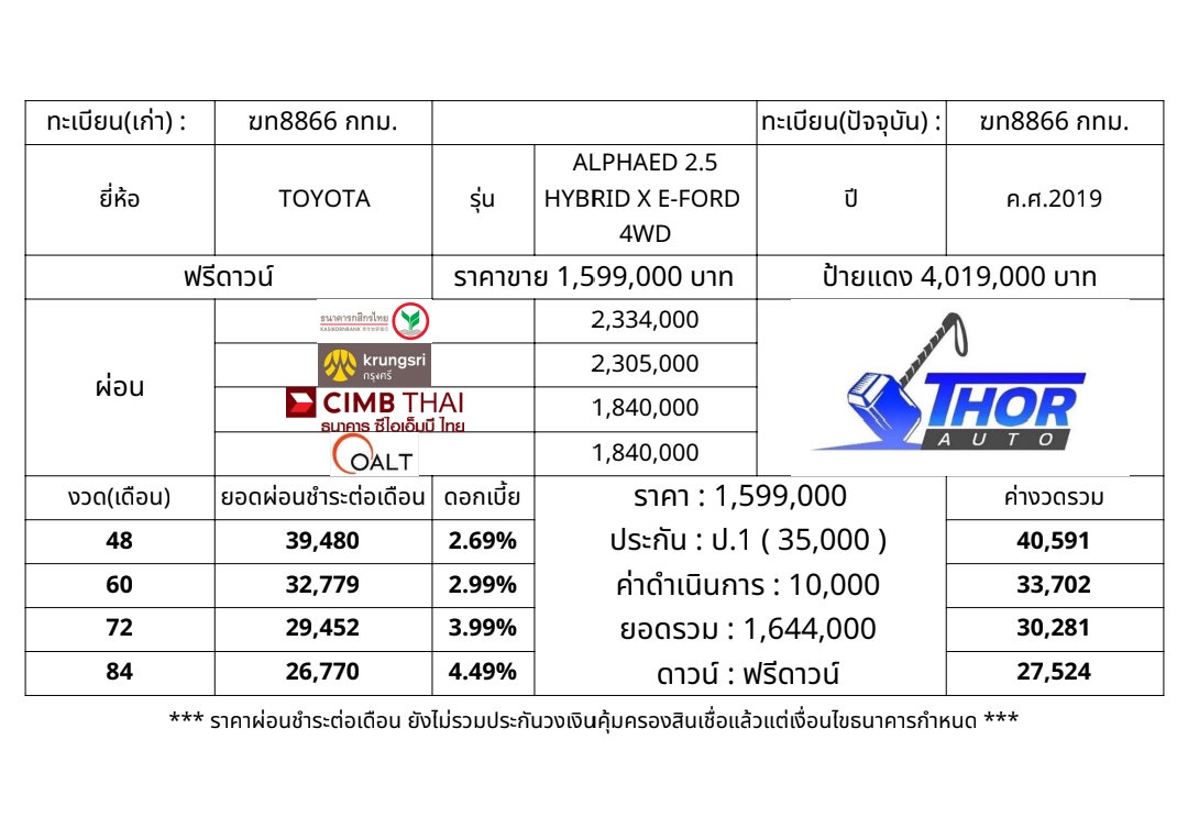 รุ่น: อัลฟาร์ด 2.5 ไฮบริด เอ็กซ์ อี-โฟร์ 4x4 (Alphard 2.5 Hybrid X E-Four 4WD) / ปี 2019 (โฉม AH30 ไมเนอร์เชนจ์)